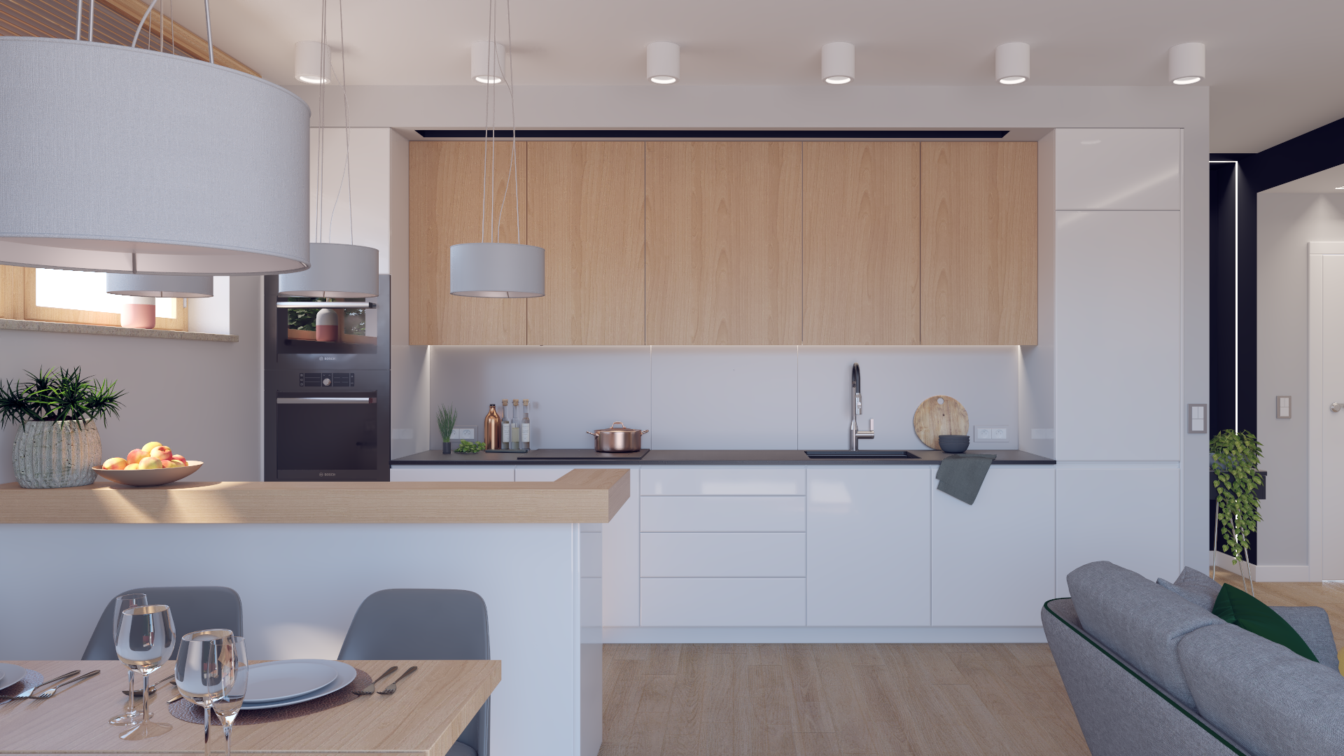 Strefa dzienna z aneksem kuchennym w jasnych ciepłych kolorach. Ściany w bardzo delikatnym odcieniu beżu są przełamane tynkiem strukturalnym o porowatej teksturze firmy Luxmal, a także uporządkowane przy użyciu sztukaterii ściennej firmy Mardom. Na podłodze została wykorzystana deska podłogowa Parkiet Studio ułożona w jodłę francuską. Kuchnia w bieli połączona z drewnopodobną płytą laminowaną firmy Egger. Całość uzupełniają lampy firmy Kaspa - szkło ze złotem - oraz tapeta Casamance.